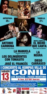 Fuimos y nos volvimos a eso de las cuatro de la mañana. sin apenas ver a José el Francés y sin llegar a catar a la Manuela, ni al Bicho. Esto es Cai, el concierto empezó con hora y cuarto de retraso. Abrió con Diego Carrasco y su ‘gitano hippie’, siguió con el torrente de voz de La Negra, llegó el plato fuerte de Carmona que tocó varias canciones de su nuevo disco ‘De noche’ y continuo con los Delinqüentes que se salieron con un Tomasito, que por su presencia en el escenario y su estilo, me recordó a Mick Jagger, quizás por que la actuación de Carmona me trajo a la memoria el concierto de los Rolling del año 90, en el que los Ketama fueron los teloneros.