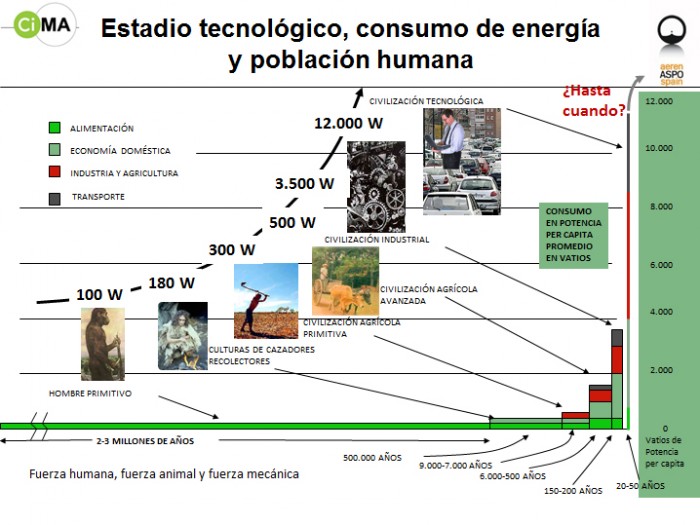 Hoy consumimos unas 20 veces más energía que a principios del siglo XX. La población humana se ha multiplicado desde entonces por un factor algo superior a 6, lo cual quiere decir que los 7.000 millones de seres humanos actuales consumimos, en promedio, unas 3 veces más energía per cápita que el ser humano de principios del siglo XX.