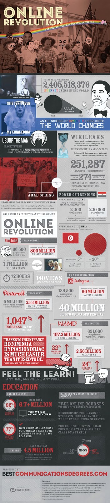 El cambio había empezado, una rueda que todos los gobiernos han intentado frenar o controlar se había puesto en movimiento, un movimiento que nos ha llevado a un mundo en el que aproximadamente 2.500 millones de personas están contectadas a la red, en el que servicios como Facebook tienen 963 millones de usuarios, Google recibe más de 1.000 millones de usuarios únicos al mes, tiene 800 millones de usuarios en youtube y las cifras siguen creciendo.