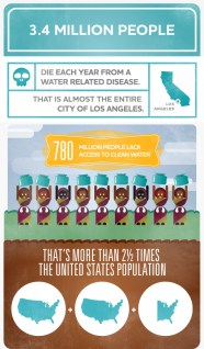 Every 20 seconds, a child dies from a water-related illness.Women spend 200 million hours a day collecting water.Three times more people lack water than live in the United States.