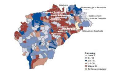 Se puede observar sin embargo, en el siguiente mapa, que la región del Nordeste de Segovia, se encuentra por debajo de la media provincial.