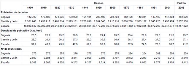 La siguiente tabla muestra la evolución de la población de España, Castilla y León y Segovia desde inicios del siglo XX. Se puede observar que mientras España ha multiplicado su población en 2,45, Segovia ha incrementado en menos de un 0,001% su población.