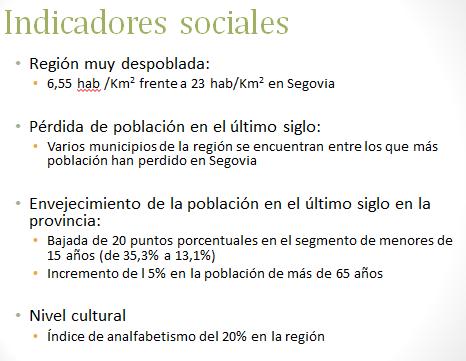 Con el fin de analizar la situación actual desde el triple plano; económico, social y ambiental, se han seleccionado una serie de indicadores que han permitido establecer una imagen de cuál es la situación actual y cuál ha sido la evolución en los últimos años de esta región del Nordeste de Segovia.