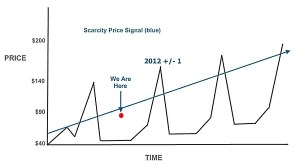 Desde una perspectiva economicista, el peak oil debería traducirse en precios permanentemente altos. Ésta es una visión simplista, propia del pensamiento económico liberal, que no entiende el papel de la energía en la economía. Lo más curioso es que no pocos de los estudiosos del peak oil llevan años afirmando que la llegada al máximo de producción del petróleo lo que genera es volatilidad en el precio (yo mismo lo decía enel quinto post que escribí en este blog, el 3 de febrero de 2010). En mi caso concreto y para más inri, cuando la fase de precios altos se prolongó un poco más de lo esperado me criticaron porque no acababa de llegar la bajada de precios que pronosticaba (ver post del 28 de marzo de 2014, seis meses antes de que empezase del actual episodio de precios bajos). Lo volveré a repetir, una vez más: el problema de la escasez de petróleo no es que el precio suba mucho de manera permanente. Para que el precio se mantenga permanentemente alto el petróleo tiene que convertirse en un artículo de lujo y dejar de ser lo que es ahora, es decir, el motor de la economía, y aunque algún día llegaremos a esa situación, aún estamos lejos de ese momento. En los próximos años lo que caracterizará al precio del petróleo es una volatilidad brutal, a medida que profundicemos en la espiral de destrucción de demanda – destrucción de oferta. No es simplemente decir que el precio del petróleo a veces sube y a veces baja, no. La cuestión es que durante ciertos períodos se mantendrá demasiado alto, de manera que dañará la economía en general, y después se mantendrá demasiado bajo, dañando a las compañías productoras. Esta oscilación salvaje, sin término medio (la mayor parte del tiempo el precio o será muy alto o será muy bajo, situándose en valores intermedios sólo en su rápido camino hacia arriba o hacia abajo), es lo que caracterizará la evolución del precio durante los proximos años, con un período de repetición típico que en el post de 2010 estimábamos en unos 3 o 4 años, aunque a medida que se acelere el descenso de producción los ciclos de subidas y bajadas serán cada vez más rápidos. Fíjense en la gráfica (completamente cualitativa) que Dave Cohen dibujaba ahora hace 8 años: