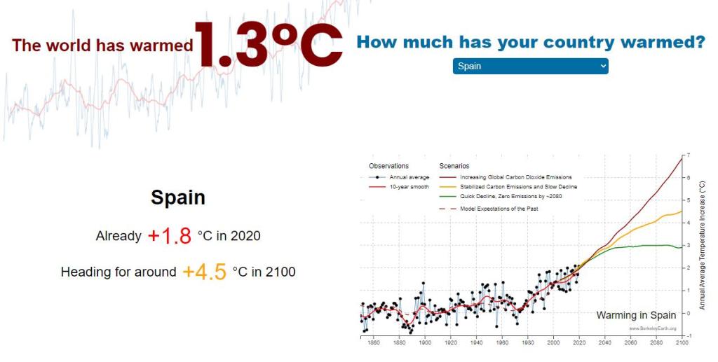 España ha tenido un aumento de temperatura por encima de la media mundial (medias desde que se guardan datos, alrededor de 1850). Ya estamos en +1,8º, si mantenemos la misma dinámica que hasta ahora o incluso reducimos lentamente las emisiones de nuestra actividad, en el año 2100 la subida de temperatura será de 4,5º.